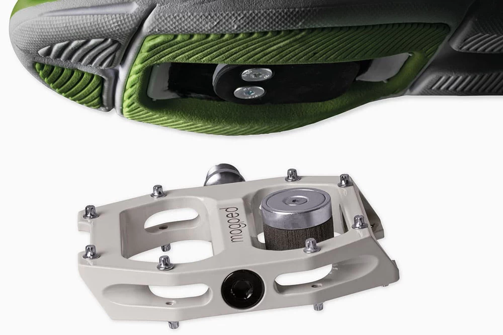 - Schuhplatte: Die Schuhplatte aus rostbehandeltem Spezialstahl kann auf jeden SPD-kompatiblen Fahrradschuh mit 2 Schrauben in wenigen Minuten montiert werden. Im Gegensatz zu anderen Systemen ist Schmutz für das magped kein Problem. Zusätzlich wird die Stolpergefahr beim Gehen reduziert und der Gehkomfort stark verbessert.