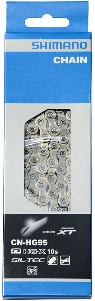Die laufrichtungsgebundene superschmale Shimano XT CN-HG95 10-fach HG-X-Kette speziell für MTB und Trekking mit schmutzabweisendem Design. Diese Kette schaltet flüssiger, spart Gewicht und erhöht insgesamt die Systemleistung.